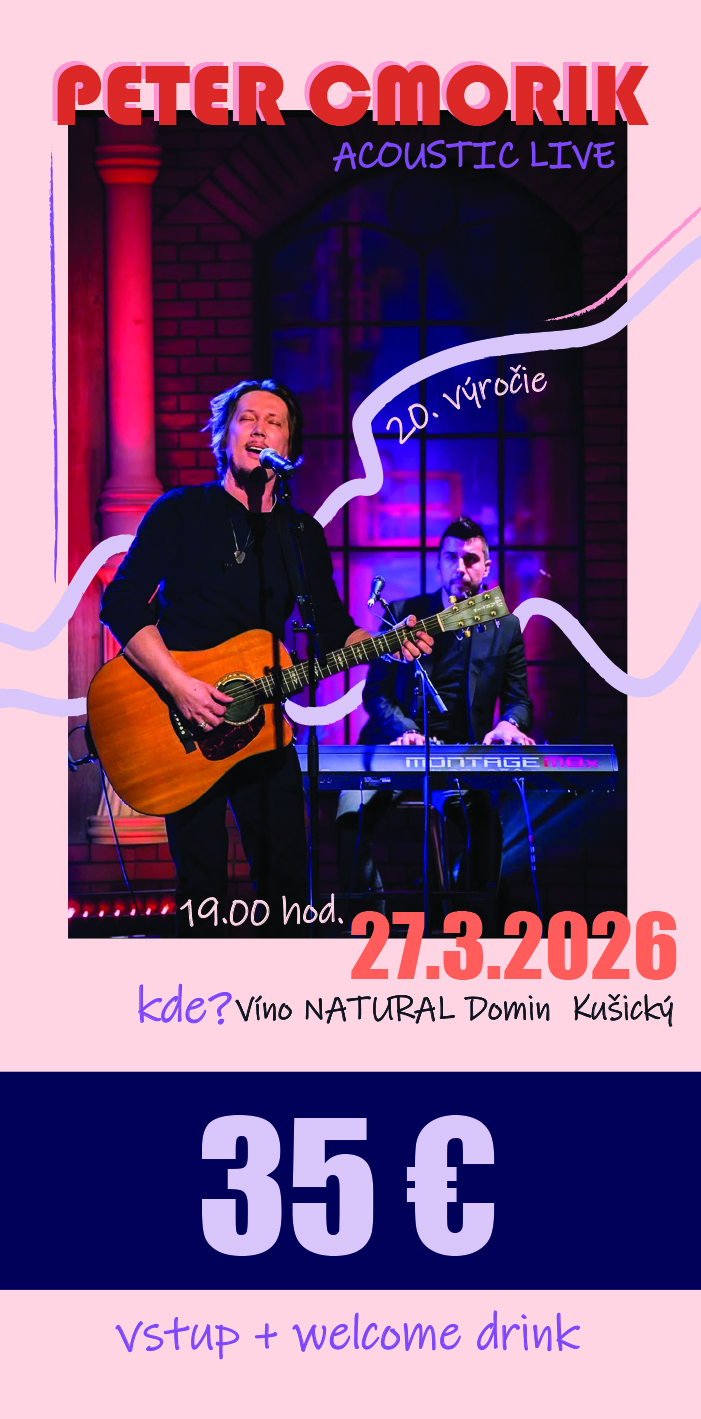 Akustický koncert Petra Cmorika pri príležitosti jeho 20. výročia na scéne, ktorý sa bude konať v priestoroch nášho vinárstva. V cene vstupenky je zahrnutý welcome drink. Kapacita je obmedzená.